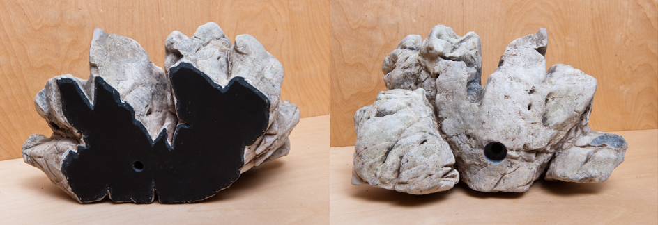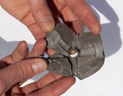 In dem Bild rechts siehst du das Ergebnis eines Bruchtestst. Durch die mehr als doppelt so große Belastung wie vorgesehen ging dieser Stein zu Bruch. Es ist sehr gut erkennbar, dass die einzelnen Bruchstücke durch die Klettergriffe Bruchsturz Sicherung zusammen gehalten werden. Solche Brüche gibt es nur bei kleinen Klettergriffen. Große Steine sind in unseren Tests noch nicht kaputt gegangen.